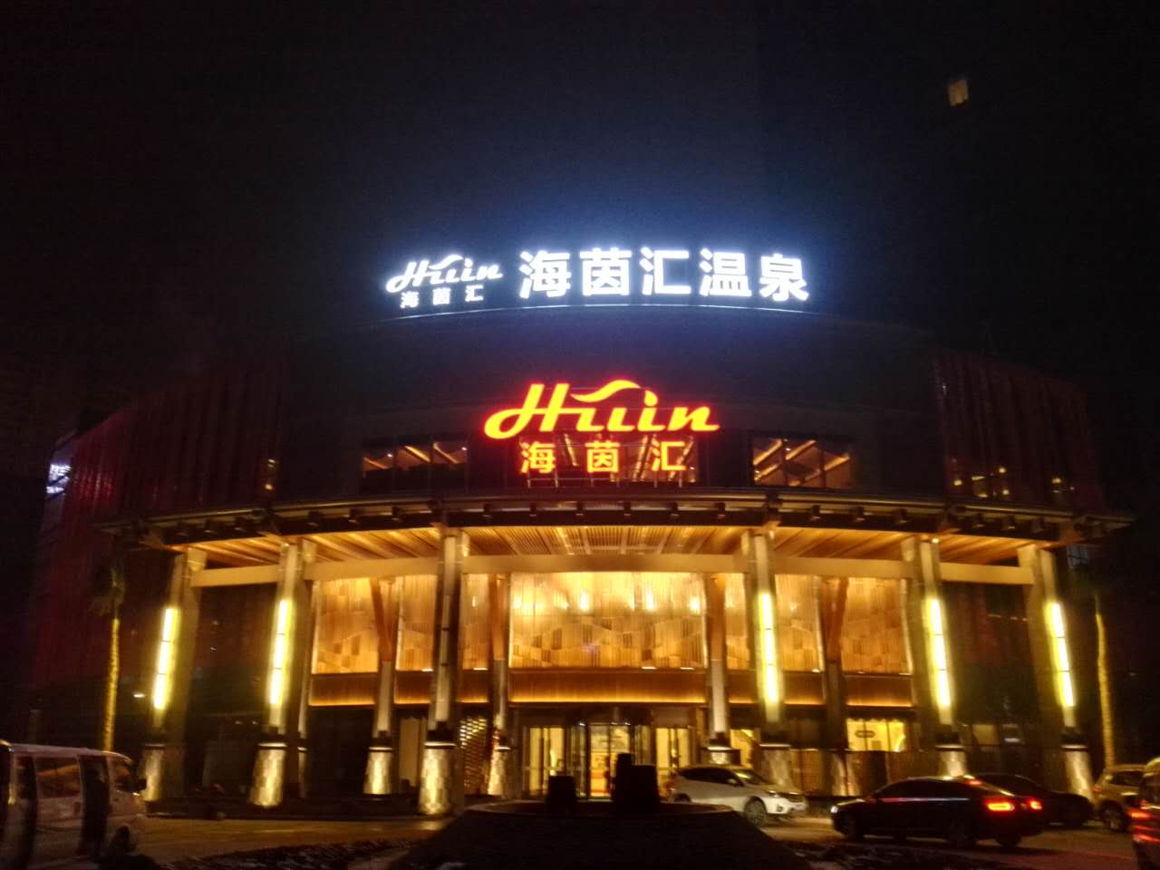 伴著夜色,當我還未走進海茵匯溫泉的大門口,她的72變就印入我的眼簾,巨型的LOGO在很遠的地方看已經很醒目,再加上他的色彩變換,更是婀娜多姿,五彩繽紛,有白色的“潔”,有紅色的“艷,有藍色的”魅“,也有綠色的”健康“,越走近仿佛置身于富麗堂皇的宮殿一般。