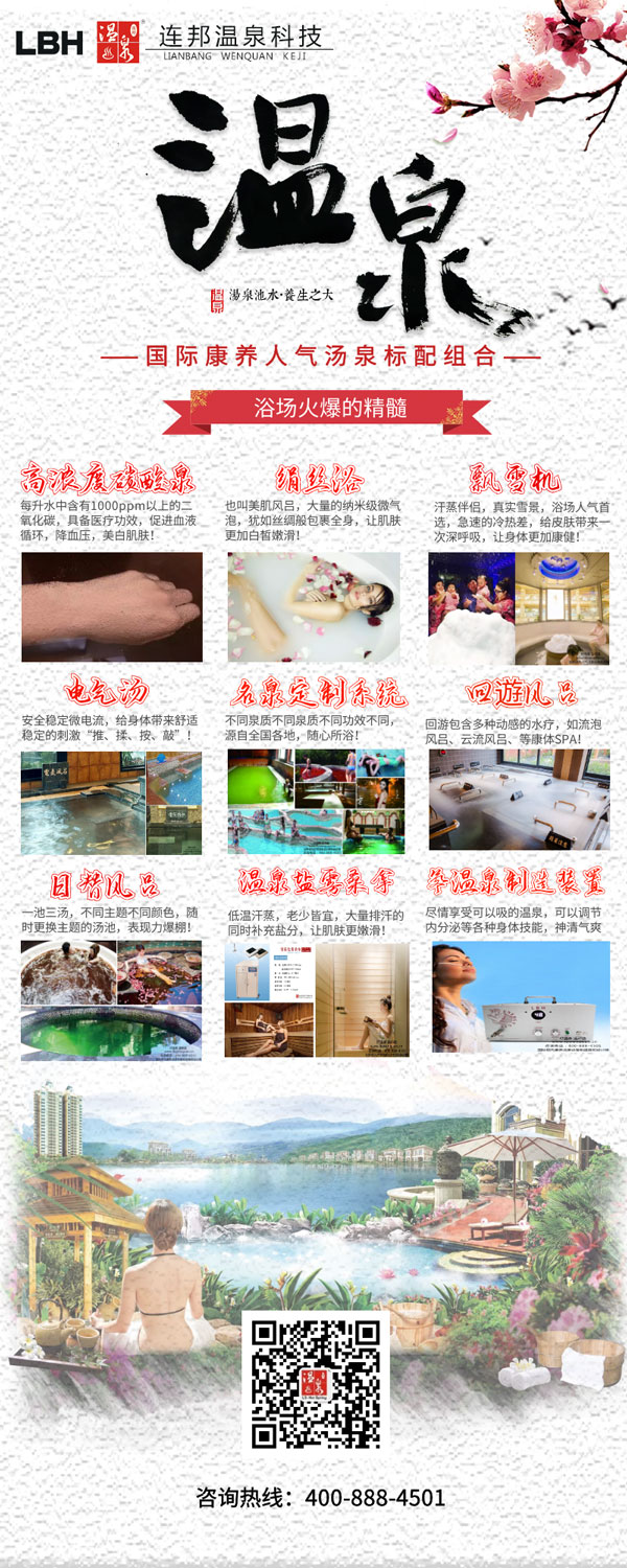溫泉度假村對于現在的社會形勢來說,算的上是現在十分火爆的一個項目,對于現在高節奏的生活,很多朋友在休息的時候,都希望自己能夠有一個很好的放松,然而溫泉就為大家提供了這么一個方式。而溫泉度假村策劃對于一個溫泉來說是十分的關鍵的,溫泉洗浴設備需要注意很多方面,第一個就是應該具有高水準,這樣才可以保障具有滿足的吸引力。