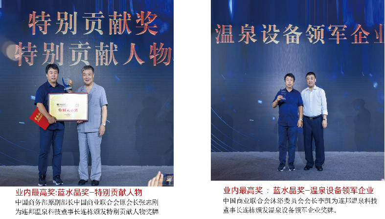 獲得2019年沐浴行業藍水晶獎的最高榮譽:連邦溫泉科技董事長連棟獲得年度特別貢獻獎(2019年度中國唯一獲得此榮譽者,由商務部原副部長張志剛先生親自頒獎)連邦溫泉科技獲得湯泉中國藍水晶獎優秀供應商獎。