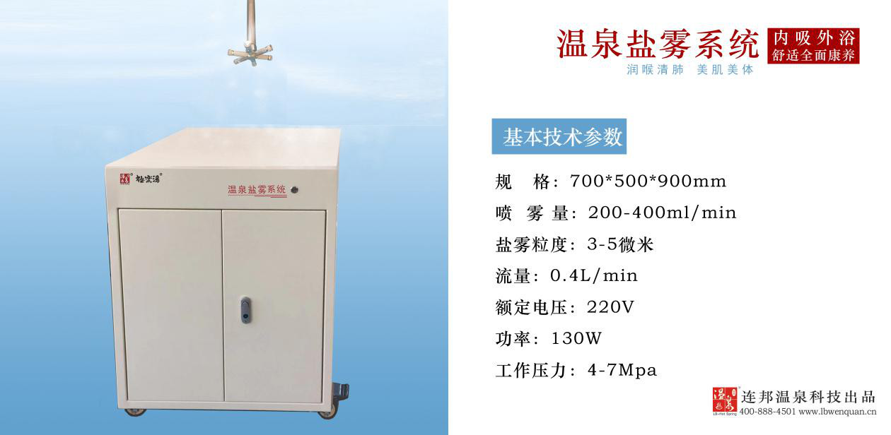 由日本株式會社極樂湯溫泉技術研究所監制,連邦溫泉科技出品的溫泉鹽霧系統,模擬人工鹽霧氣候,在中國率先推出商業化和家庭化的“鹽霧療法”,“使人在溫泉鹽霧房中待上45分鐘,等同于在海邊停留3天”。