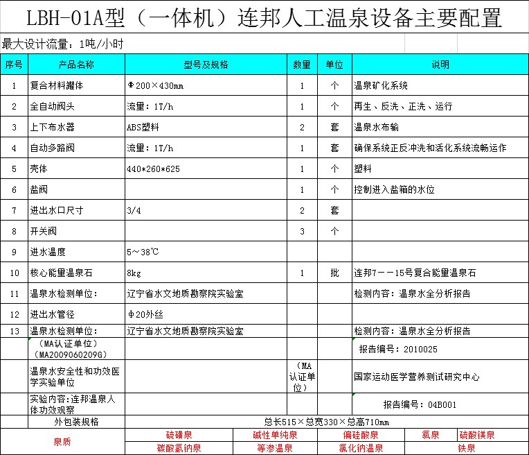 可應用泉質:1.硫磺泉 2.堿性單純泉 3.偏硅酸泉 4.氡泉 5.硫酸鎂泉 6.碳酸氫鈉泉 7.等滲溫泉 8.氯化鈉溫泉 9.鐵泉 。